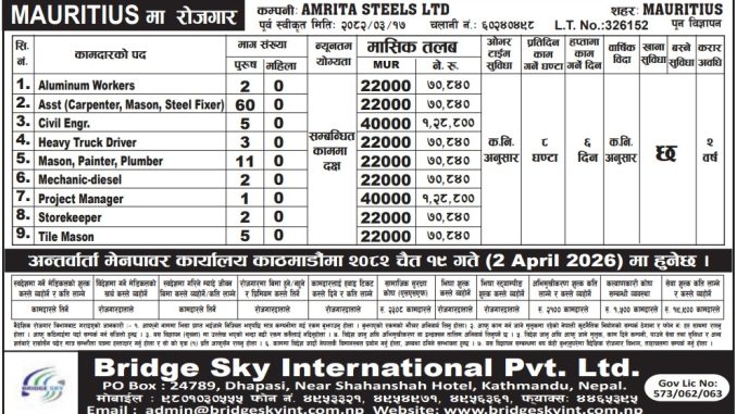 AMRITA STEELS LTD, a reputed and rapidly growing industrial company, is pleased to announce multiple employment opportunities for skilled and dedicated workers through Bridge Sky International Pvt. Ltd. We are seeking motivated individuals who are ready to contribute their expertise and grow within a professional and dynamic work environment.