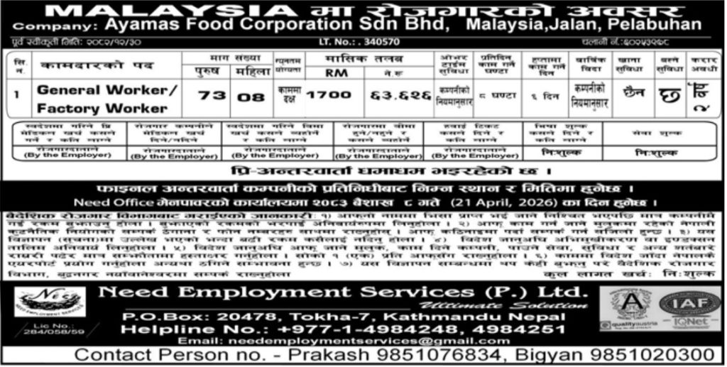 A great employment opportunity is now available for individuals seeking to work abroad in the manufacturing sector. A reputable company in Malaysia, Ayamas Food Corporation Sdn Bhd, is currently hiring factory workers through the authorized recruitment agency Need Employment Services Pvt. Ltd. A total of 81 positions are open, offering a stable and rewarding career for skilled candidates.