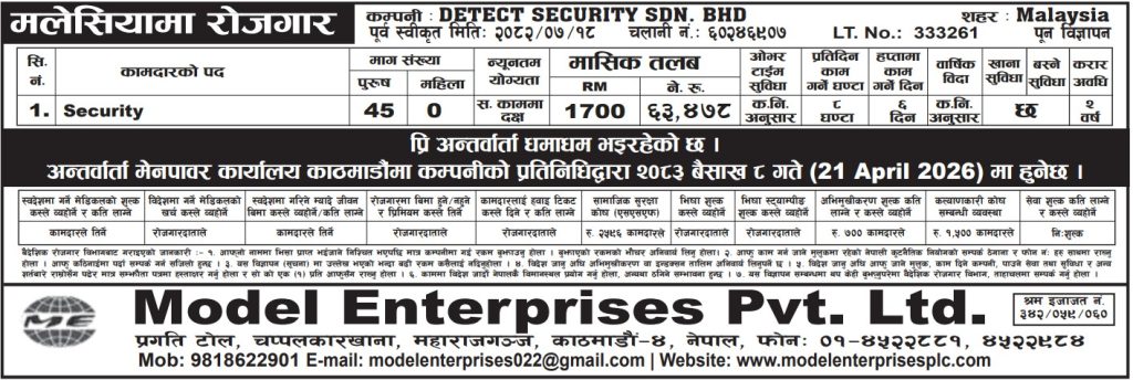 Interested candidates should apply through Model Enterprises Pvt. Ltd. as soon as possible. Since the number of vacancies is limited, early application is strongly recommended to secure your chance.