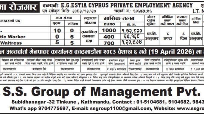 A reputed overseas employment opportunity is now available for skilled and motivated individuals seeking to build their careers abroad. E.G.ESTIA Cyprus Private Employment Agency, in collaboration with S.S. Group of Management Pvt. Ltd., is pleased to announce multiple job openings in Cyprus.