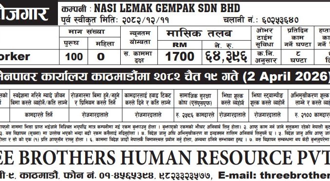NASI LEMAK GEMPAK SDN BHD, a popular and rapidly expanding food service company, is pleased to announce exciting job opportunities for Restaurant Workers. In partnership with THREE BROTHERS HUMAN RESOURCE PVT. LTD., we are seeking energetic, responsible, and skilled individuals who are passionate about working in the hospitality and food service industry.