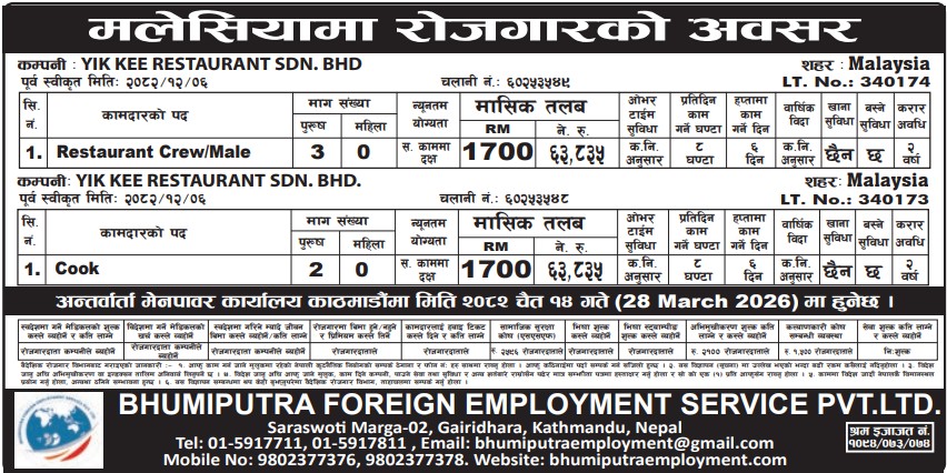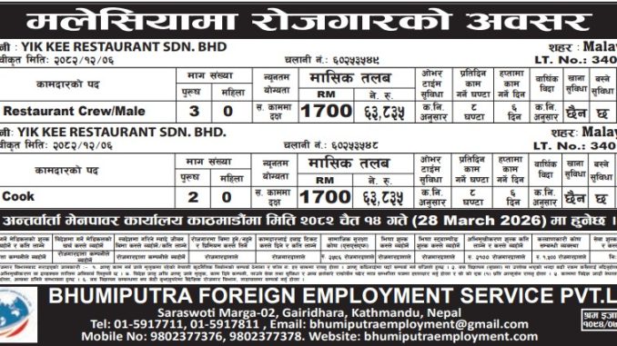 YIK KEE RESTAURANT SDN. BHD is pleased to announce exciting employment opportunities for motivated and skilled individuals who are looking to build their careers in the food and hospitality industry. This recruitment is being conducted through BHUMIPUTRA FOREIGN EMPLOYMENT SERVICE PVT. LTD., a trusted agency facilitating overseas employment.