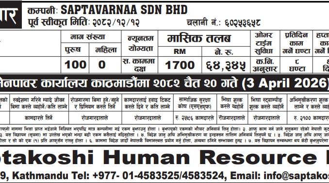 A well-established overseas company, SAPTAVARNAA SDN BHD, in partnership with Saptakoshi Human Resource Pvt. Ltd., is pleased to announce a large-scale recruitment drive for motivated and hardworking individuals. This is a great opportunity for candidates who are seeking foreign employment with reliable benefits and a secure working environment.