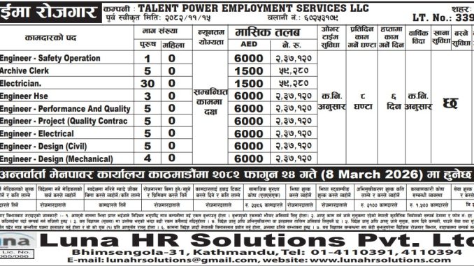 An excellent overseas employment opportunity is now available in the United Arab Emirates (UAE) for skilled and motivated individuals looking to advance their careers. TALENT POWER EMPLOYMENT SERVICES LLC, a reputable company in the UAE, is currently seeking qualified candidates for multiple technical and administrative positions. The recruitment process is being managed by Luna HR Solutions Pvt. Ltd., a trusted agency known for connecting candidates with international employers.